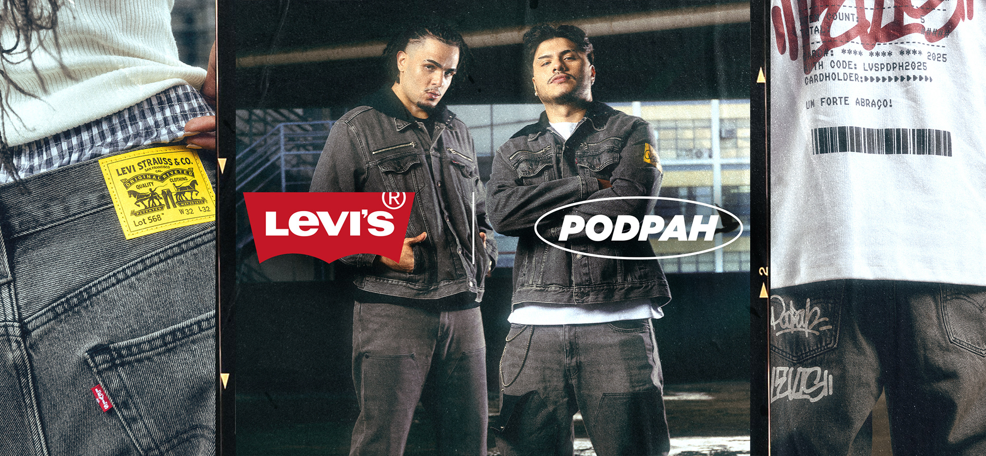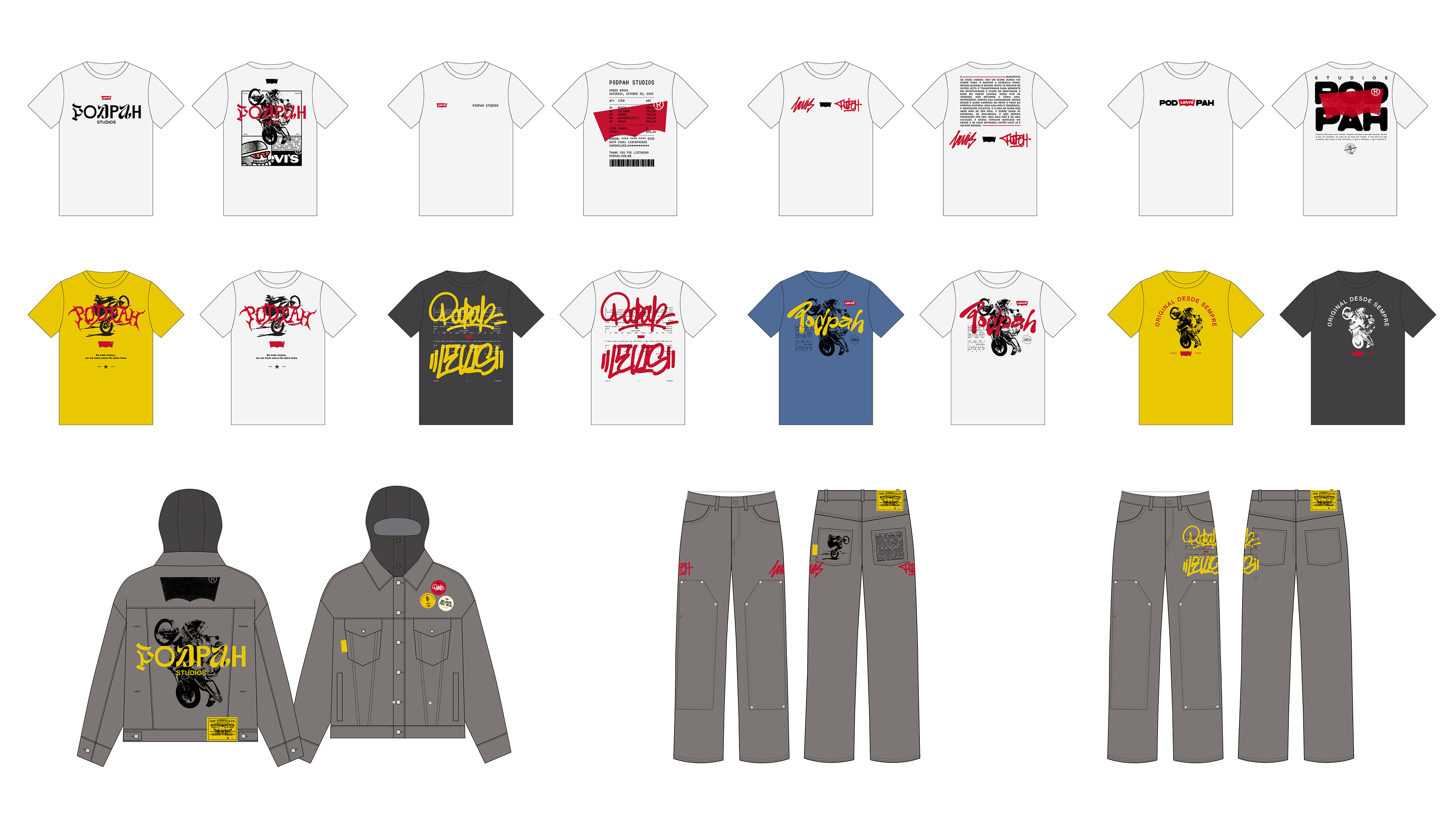 Direção de arte para o lançamento da Coleção Levi's x Podpah, criação de gráficos para o desenvolvimento das peças, captação e edição do video Behind The Scene do Shooting.